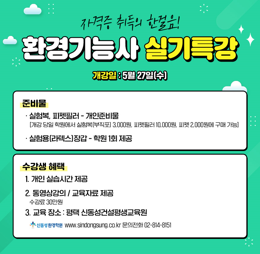 ■ 환경기능사는 개강일+개인실습1회로 이루어져 , 개강날에는 꼭 참석해주셔야 합니다! (개인연습만X) ■ 개강일: 5월27일(수) ■ 개인실습일: 6월3일(수) ■ 실기 특강은 학원강의에서 신청해주시면 됩니다! (인원마감시 신청 불가) ■ 교육장소: 평택 신동성건설평생교육원 (경기도 평택시 평택로 32번길 21 해룡빌딩 6층)